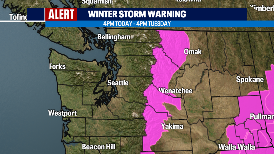 A Winter Storm Warning is in effect for the eastern slopes of the Cascades through 4pm Tuesday. We are expecting heavy mountain snow of 15"-25".
