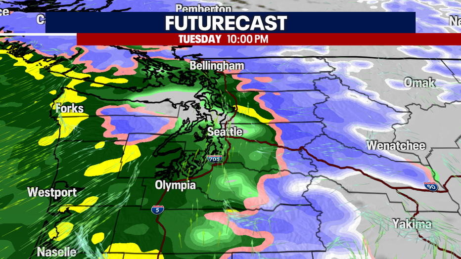 Tuesday night, snow levels will rise to about 3,500 feet and a more organized weather system will take aim at the Pacific Northwest. This will bring widespread rain to the lowlands and snow to areas above Snoqualmie Pass through Wednesday. South winds will be breezy, gusting to 30 to 40 mph.