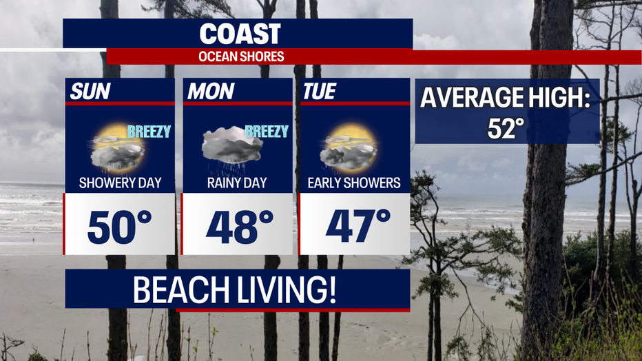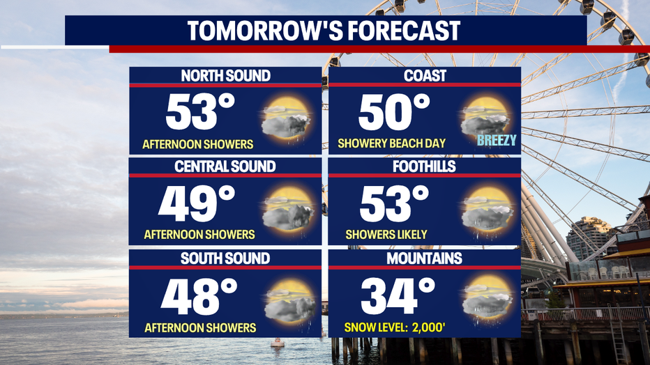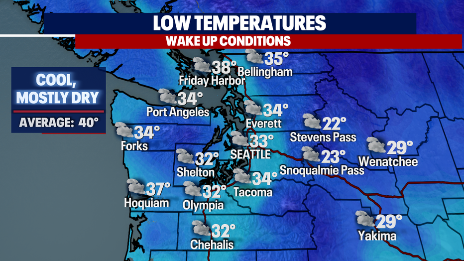 Highs ON Sunday land in the upper 40s to low 50s along the I-5 corridor. The foothills warm to near 53 for places like North Bend.