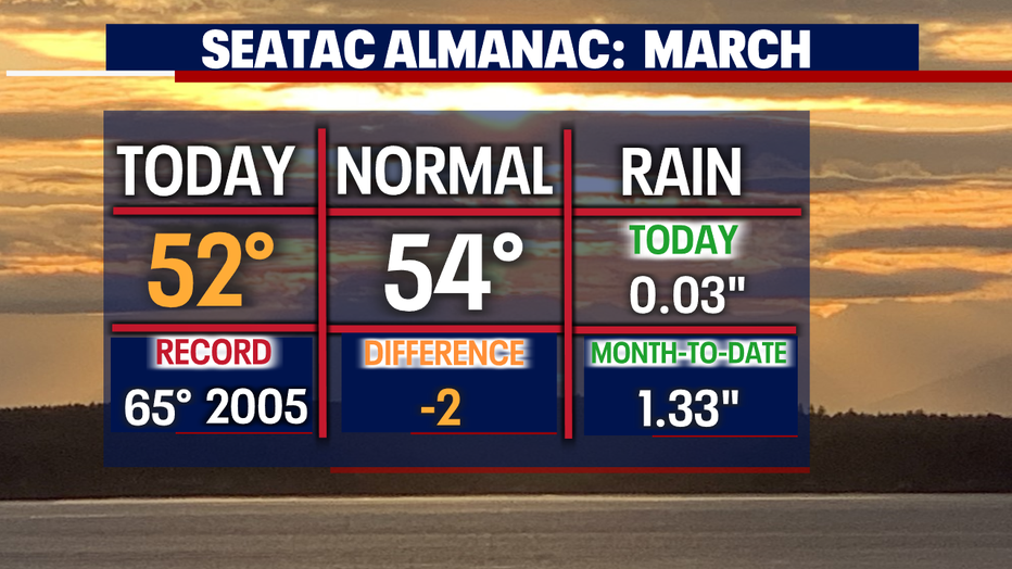 Seattle - So close, but not quite! We were just two degrees away from warming to the normal seasonal high temperature Saturday. The airport hit 52 at SeaTac with just a few showers.