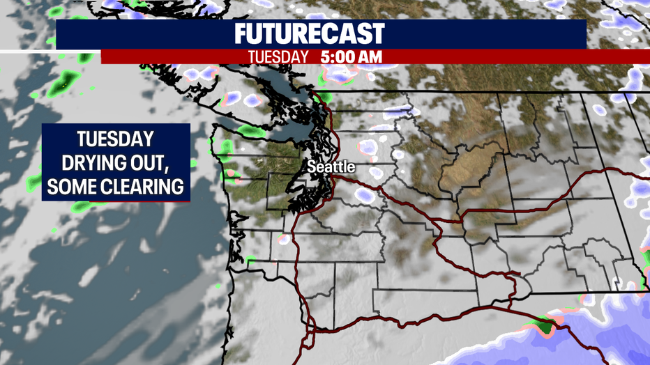 Showers wrap up by early Tuesday for a mainly dry day under mostly cloudy skies. Highs push into the upper 40s.