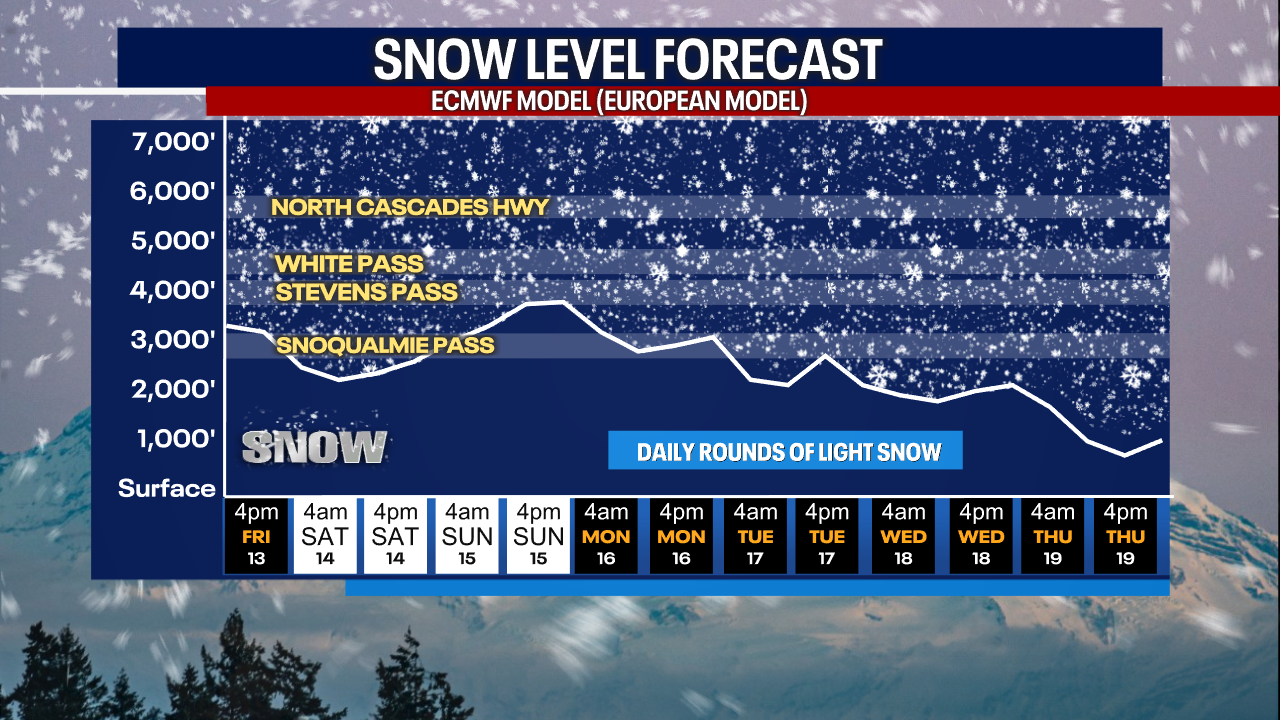 Snow levels will remain below the mountain passes this week, with daily rounds of snow showers expected starting Monday. (FOX 13 Seattle)