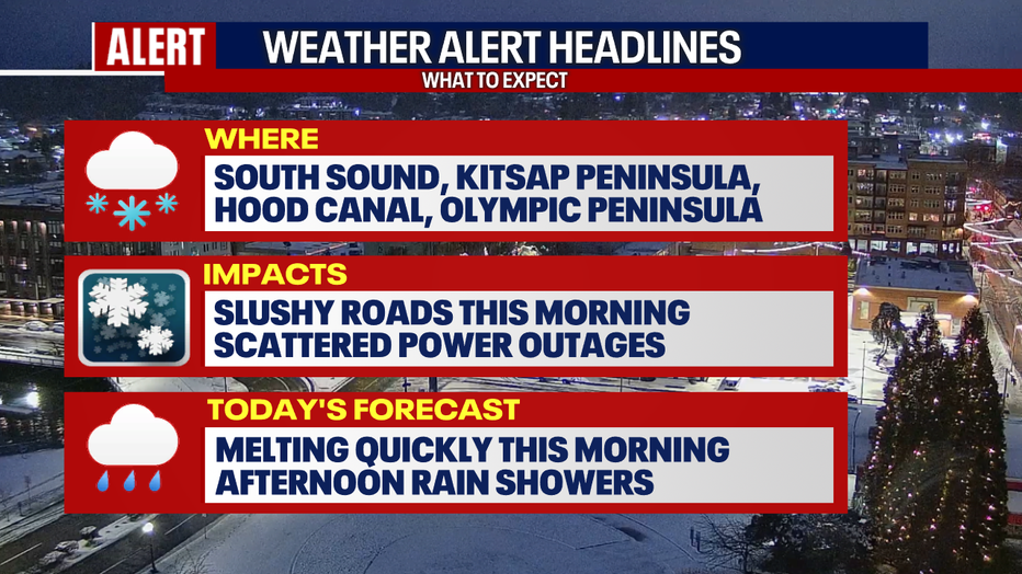 A regional Weather Alert was issued by the FOX 13 Weather team to start the day with slushy conditions in Thurston & Lewis Counties, Mason County, the Kitsap Peninsula, Hood Canal, and parts of the Olympic Peninsula.