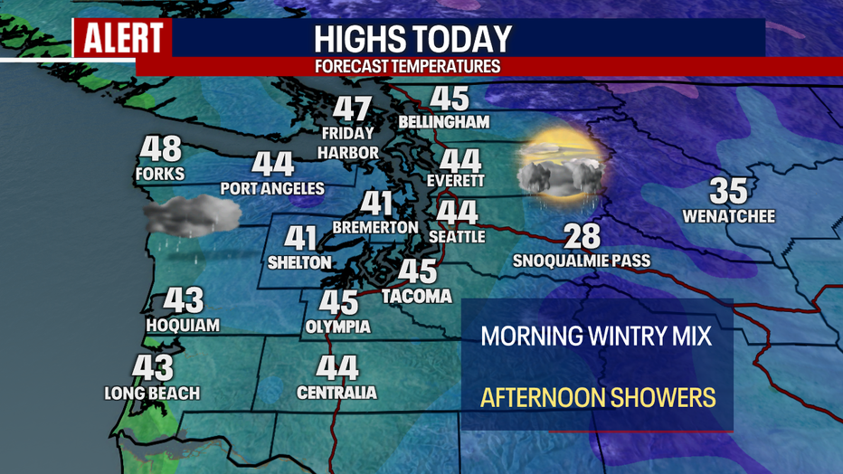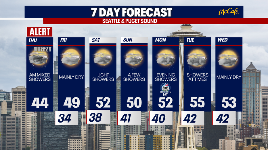 Looking ahead, the forecast will bring a chance of showers each day through the holiday weekend with highs back in the 50s. No big storms are ahead for at least the next week for Western Washington.