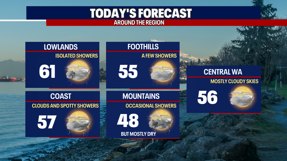 Highs today will be a solid ten degrees above where we were yesterday. Temperatures will land in the upper 50s and low 60s around Western Washington. Today will feature more clouds than sunshine. Spotty showers are possible.
