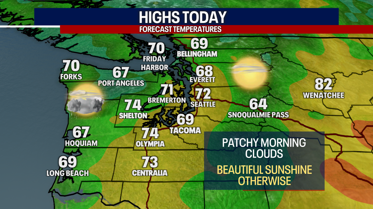 We could see some clouds pushing into the Puget Sound area this afternoon as the front dissipates, but most areas will see mostly sunny skies with highs in the upper 60s and low 70s.