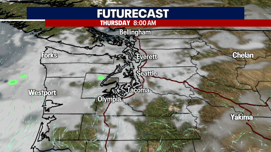 Later tonight, clouds will roll in to Western Washington, leading to a mostly cloudy start to Thursday. Clouds will continue to increase into Thursday afternoon. Temps should continue to stay mild though, in the low 70s.