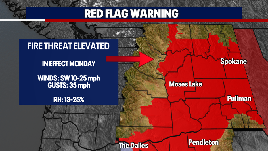 We can expect rain totals ranging between .10-.75". This will be the first time we'll see measurable rainfall in over a month! On the other side of the Cascades, due to the fire danger, they'll have a Red Flag Warning in place. Here is a look at it: