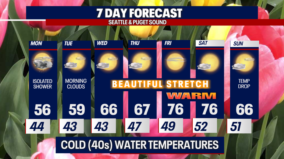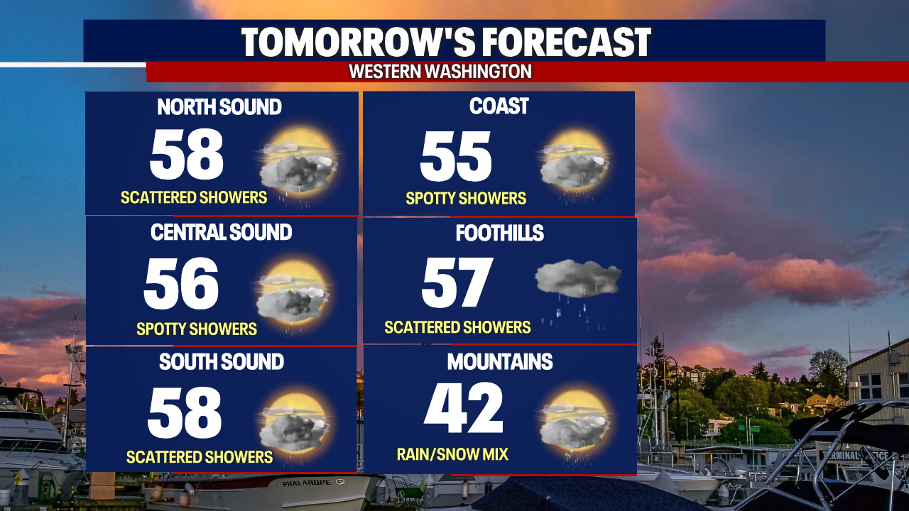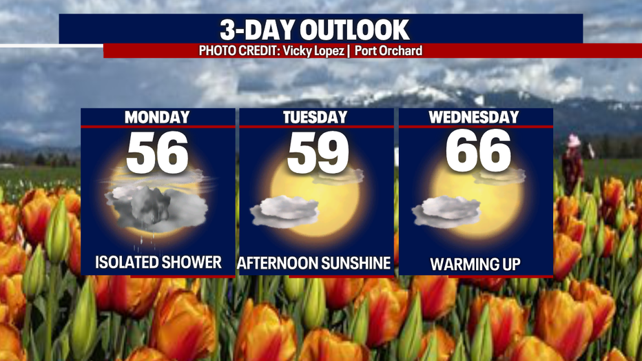 Seattle - The cloud cover and isolated showers will remain in the forecast on Monday. Temperatures will return in the mid-50s tomorrow afternoon (below normal 61F). Expect more sunbreaks at times. Here is a look at your Monday Forecast: