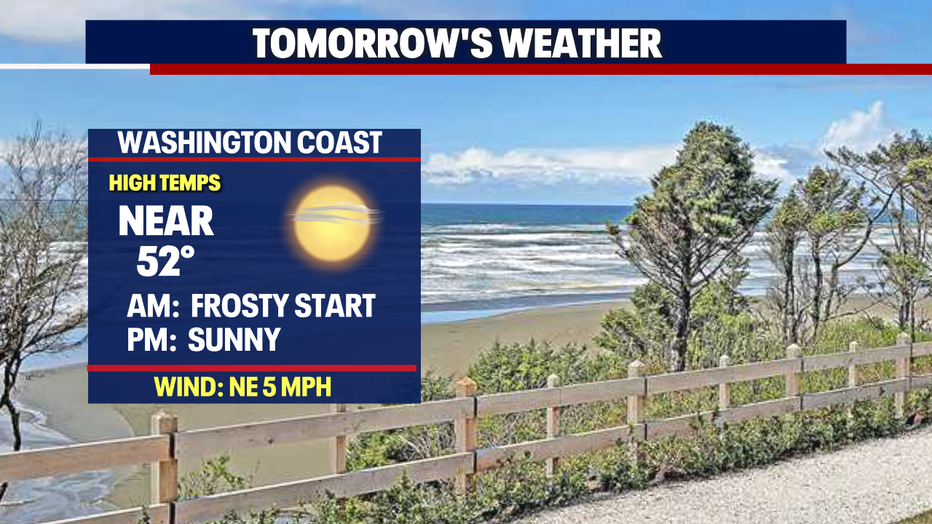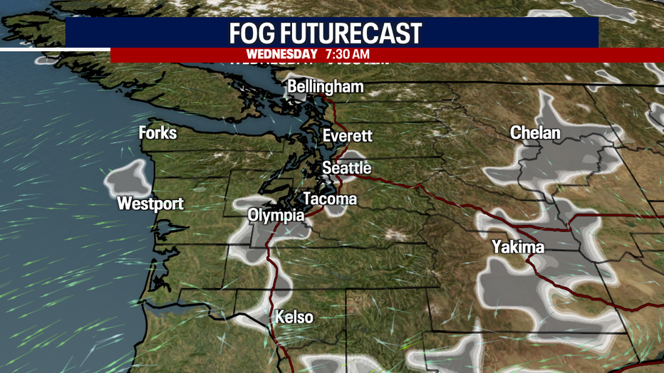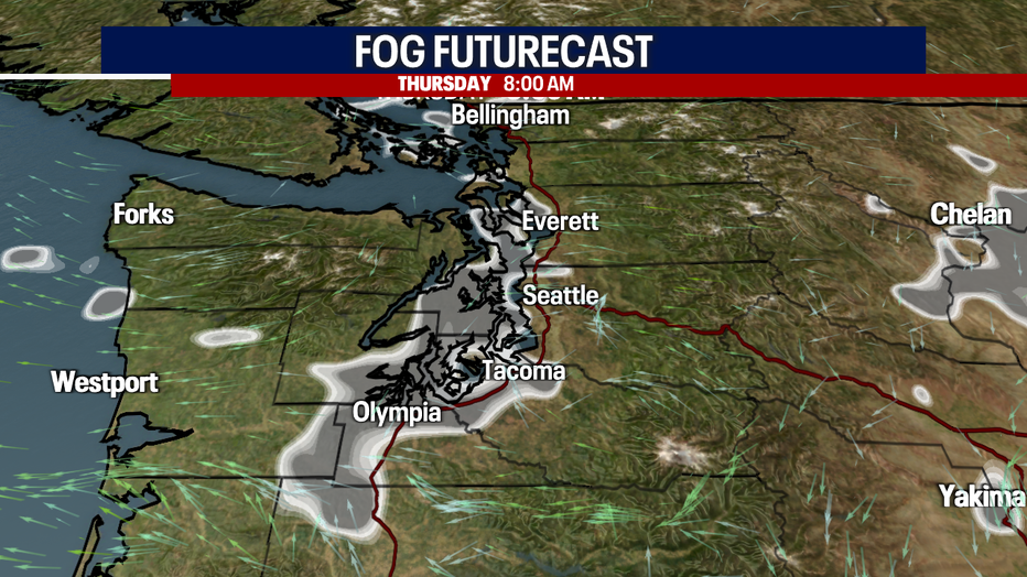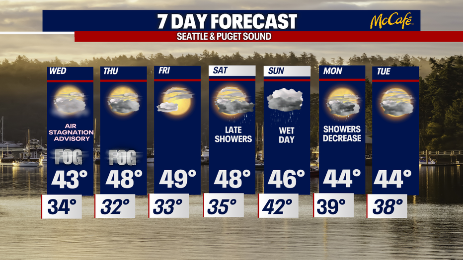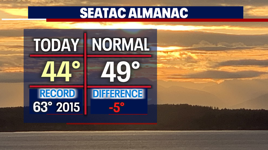 Overnight, expect fog to thicken up for many again, especially along the I-5 corridor from far north in Bellingham down to the WA/OR border. Some spots will see freezing fog as temperatures drop into the chilly zone, about five to seven degrees below average around the region. This time of year lows sit at 39 with highs landing at 49.