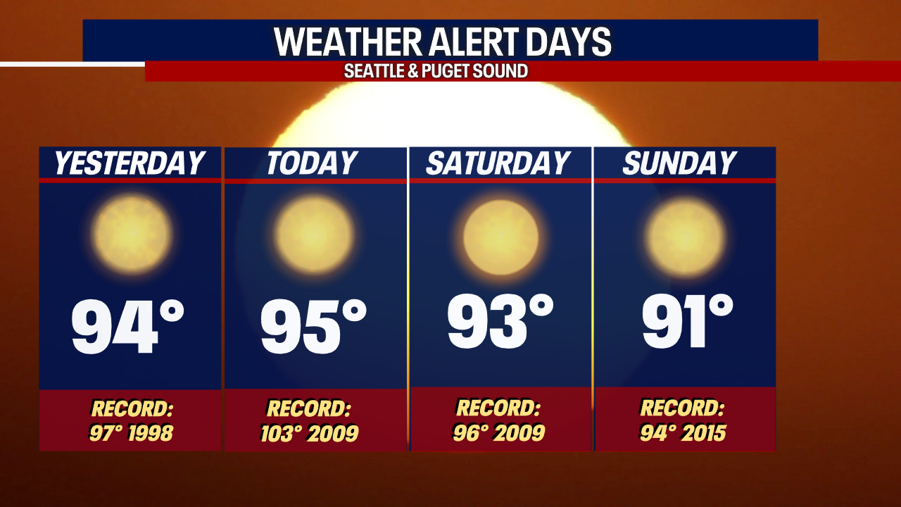 SEATTLE - Add another day to the stretch! We are now have four days in a row at 90 degrees or above… one more day and we tie the longest streak record for consecutive 90+ days.