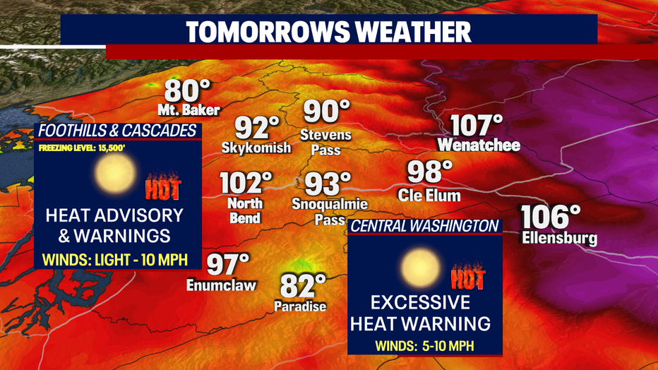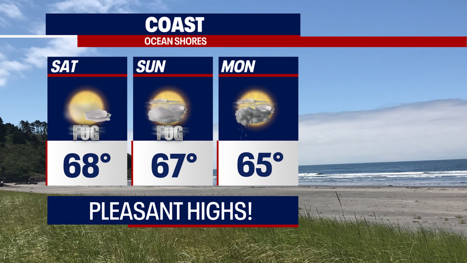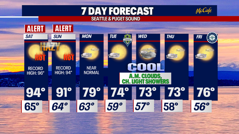 Saturday, we're expecting another scorcher for sure! Look for mid 90s across the Central Sound with even hotter conditions for the South Sound. We'll be slightly cooler for the North Sound, landing in the mid 80s with the Coast the coolest in the upper 60s after morning fog burns off.