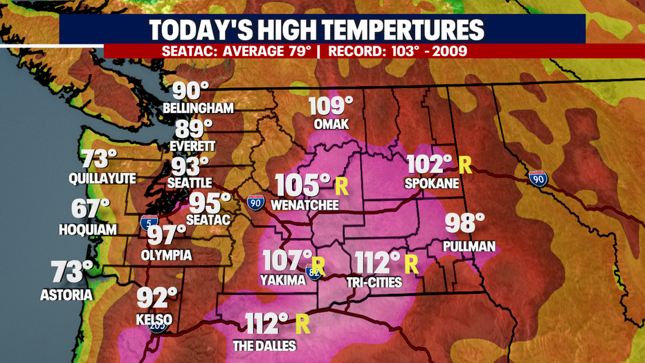 Temperatures Friday soared into the 90s again around Puget Sound with a handful of records set across Eastern WA. Pasco hit 112 today!