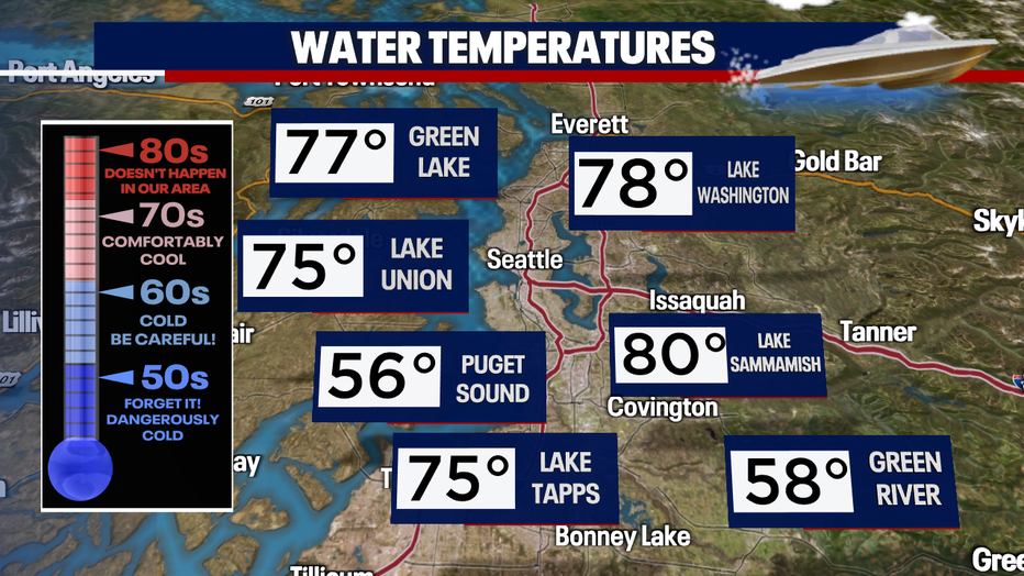 With highs hanging in the 90s we expect many folks to take to area waterways. Please remember the rules of wearing a life-jacket and swimming with a partner. Water temperatures have warmed with most lakes now in the 70s. Puget Sound and rivers are still very cold in the mid to upper 50s.