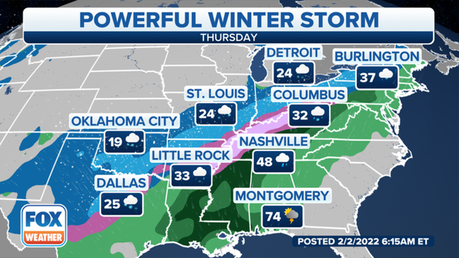 On Groundhog Day, snow, sleet and freezing rain will stretch from central and southern portions of the Rockies and Plains to parts of the Midwest and southern Great Lakes.