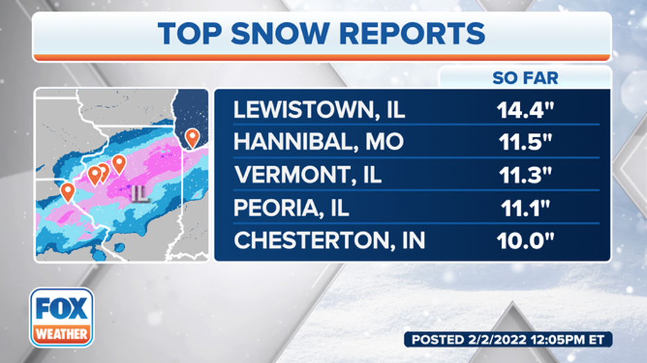 More than 6 inches of snow has been reported in a stripe from northeastern Missouri to central and northern Illinois and northwestern Indiana, including the south side of Chicagoland. The highest snowfall total in the Midwest so far is 14.4 inches in Lewistown, Illinois.