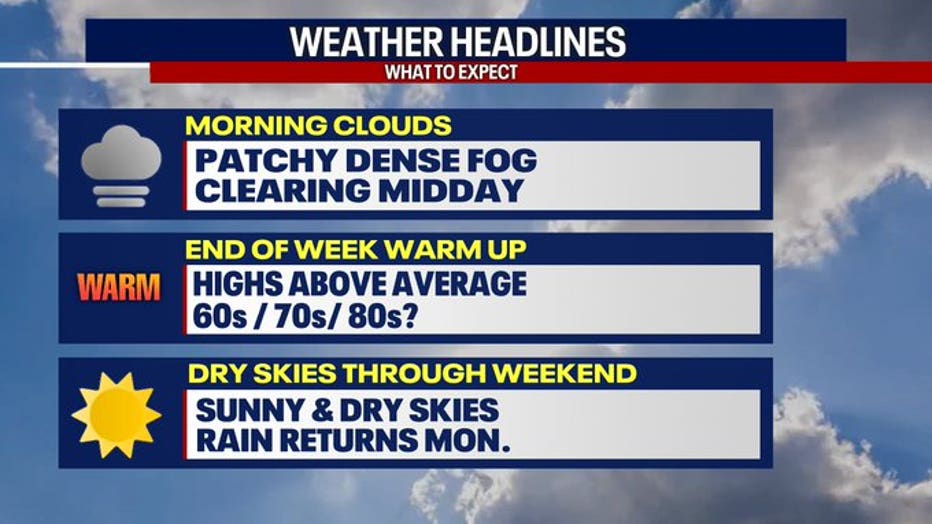 Clouds will move in again for the morning hours Thursday with lows in the low 50s. Watch for areas of patchy dense fog and morning clouds. Winds will be calm, so fog will linger until about midday.