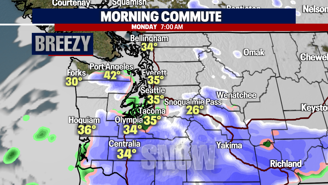 Temperatures will drop, and a new system will increase precipitation - especially across the south! If you are commuting through Pacific or Lewis county Monday morning expect snow delays. This is where we're expecting most of our accumulation. The winds will kick up as well and we can expect gusts up to 20-30 mph.