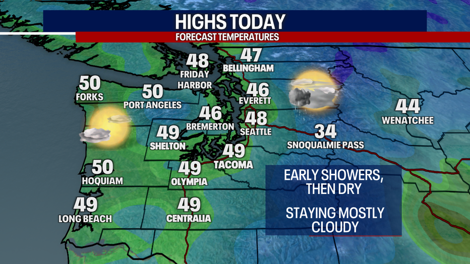 Afternoon high temperatures will be close to average for this time of year, with highs in the mid to upper 40. Areas along the coast and the strait will see more sunshine than those around the Puget Sound area.