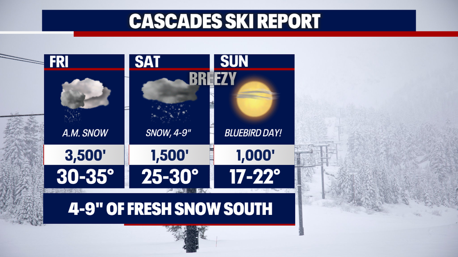 The Cascade resorts enjoyed some new snow overnight and more is expected Saturday. Sunday will be a "bluebird day" on the passes, but it may be breezy in the morning.