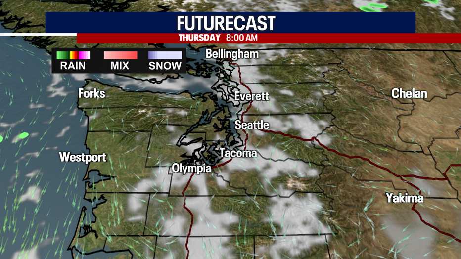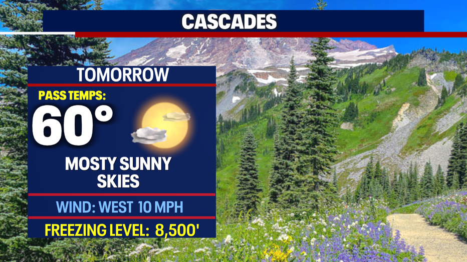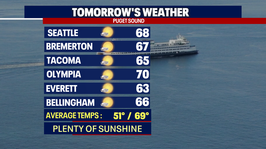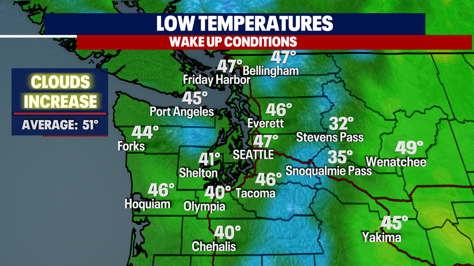 Overnight, skies are partly to mostly cloudy with temperatures running a bit chilly in the low to mid 40s. Folks in the South Sound could see 8–10 degrees below average.