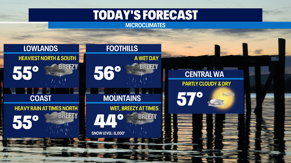 Areas on the north coast and in the north sound area will see the heaviest rain totals, but more widespread flooding is not expected. Other spots in the central and south sound will see mainly light to moderate rainfall today with breezy wind at times.