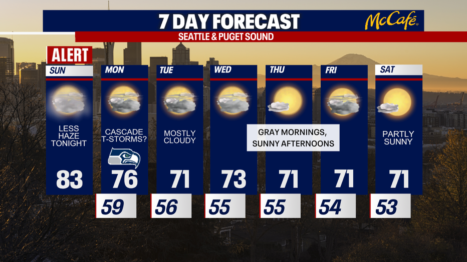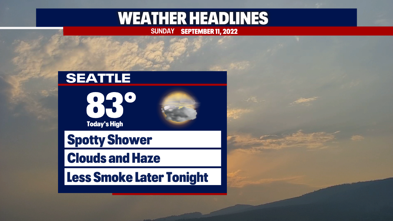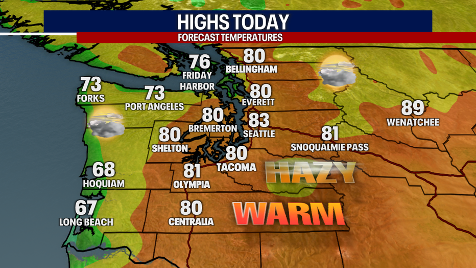 Our temperature forecast for today is a bit fluid: while we're forecasting the 80s for most along the I-5 corridor, clouds, smoke and a few showers could limit highs somewhat. Heading into Monday, highs drop comfortably to the mid 70s.