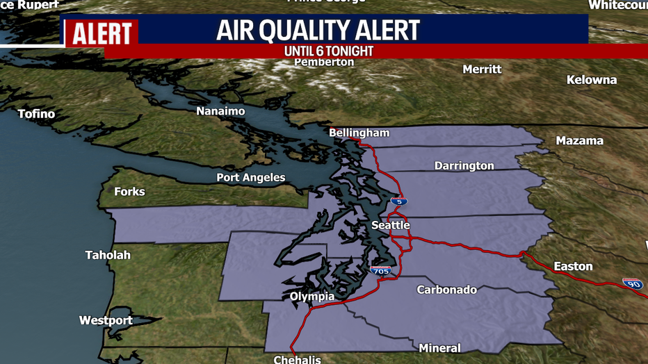 SEATTLE - Air quality remains poor around the North Sound region today, but we're already seeing improving conditions for Central and South Puget Sound. Smoke will clear for much of Puget Sound by Monday morning, but haze will continue for communities immediately surrounding wildfires (like the Bolt Creek Fire along the King/Snohomish County line).