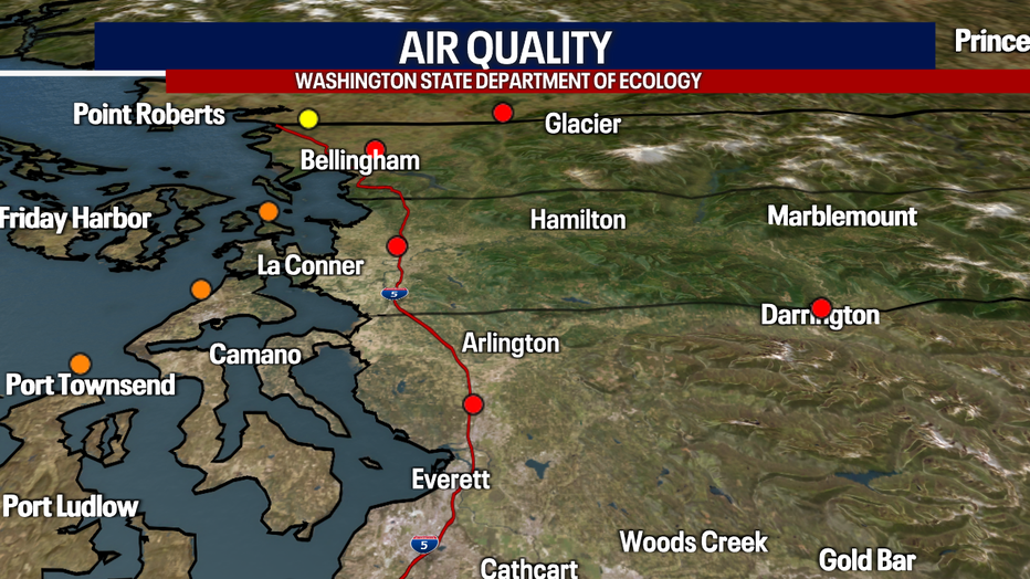 At noon today, air quality in the North Sound ranged between "unhealthy for sensitive groups" and "unhealthy" levels. For the latter, it's recommended that everyone limit their time outside and avoid strenuous activities. Keep your A/C on recirculate (that is, if you have air-conditioning. If you don't have A/C at home, I'd suggest heading into a building with cool, clean air).