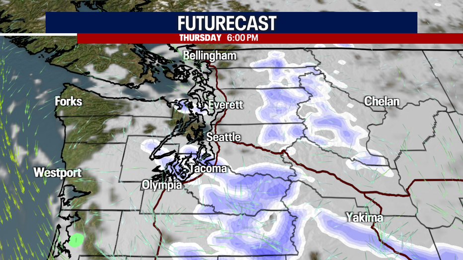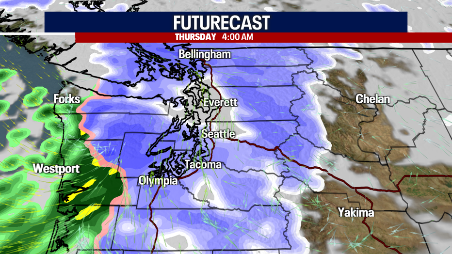 There could be a few flurries tonight in Western Washington, but the heaviest snow moves in between midnight and 9 a.m. Thursday. This particular snow event will be much shorter than Sunday's storm; however, the snow could fall heavily early Thursday. Again, one to three inches of snow in the lowlands looks likely, but localized heavier totals are possible under stronger bands. Some communities may not see much snow while others get a fresh coating.
