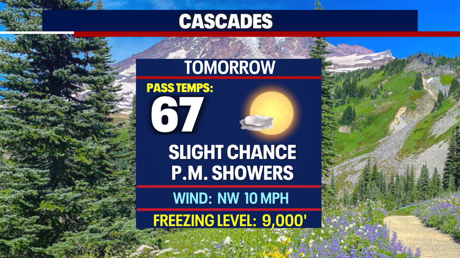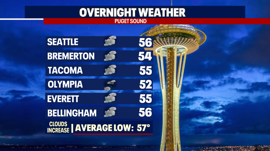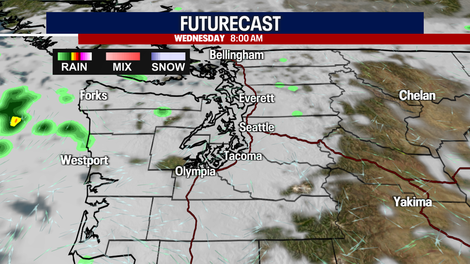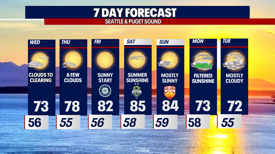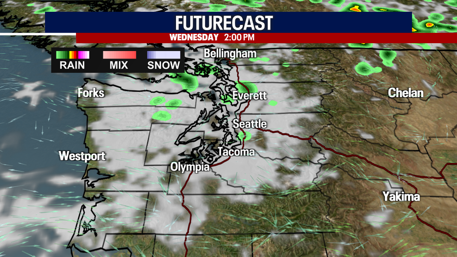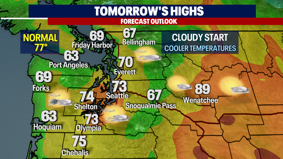 Look for highs to hang on the cooler side Wednesday. Temperatures only heat into the upper 60s for the North Sound with warmer highs, in the low 70s, through the Central Sound with slightly warmer readings for South Sounders.