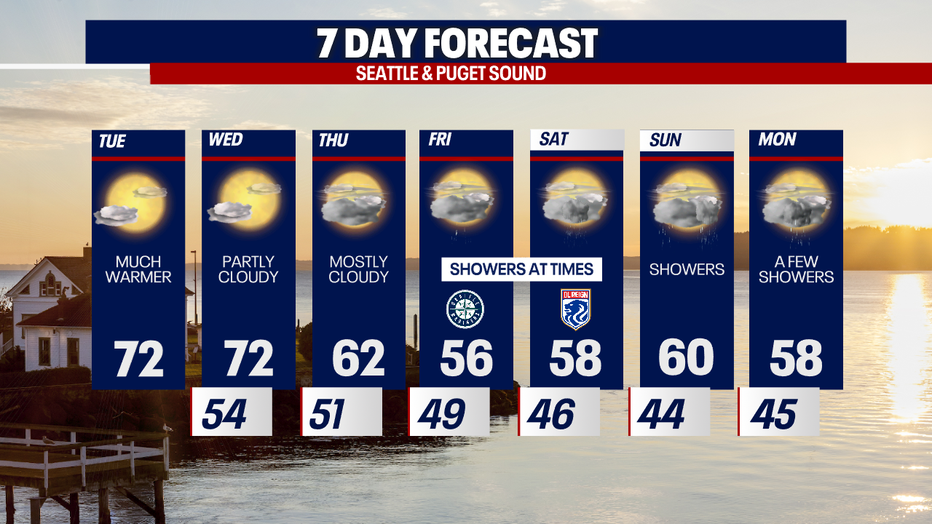 Seattle - Tuesday is looking much warmer in Western Washington with partly sunny skies and a chance for thunderstorms in the Cascades this afternoon.