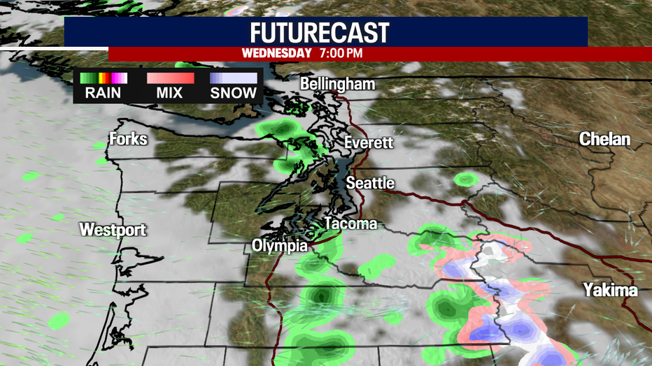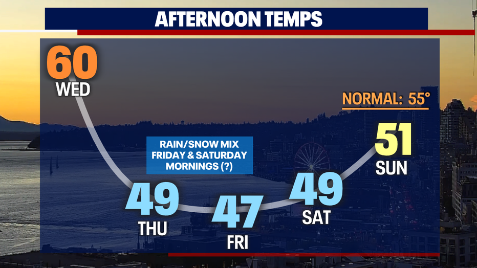 Friday and Saturday morning, there's a slight chance for a rain/snow mix for some in the lowlands, but any impacts or accumulations are unlikely because temperatures will be too borderline.