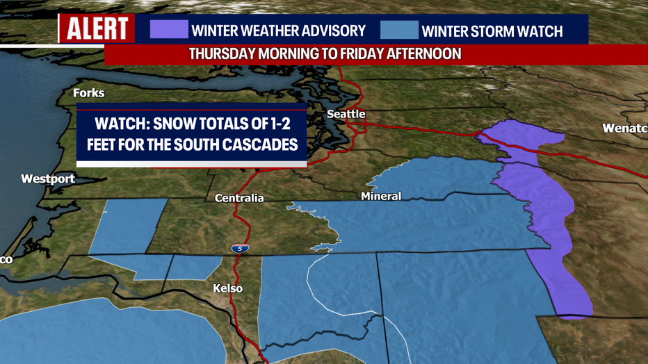 For the South Cascades, a Winter Storm Watch is in effect from Thursday morning to Friday afternoon. Between one and two feet of snow could accumulate above 2,500 feet.