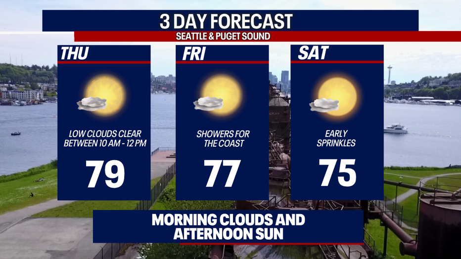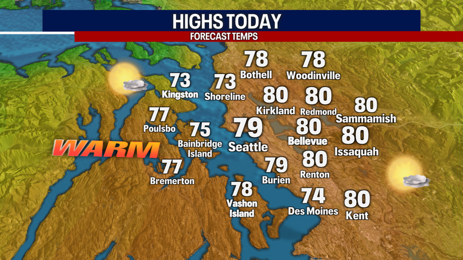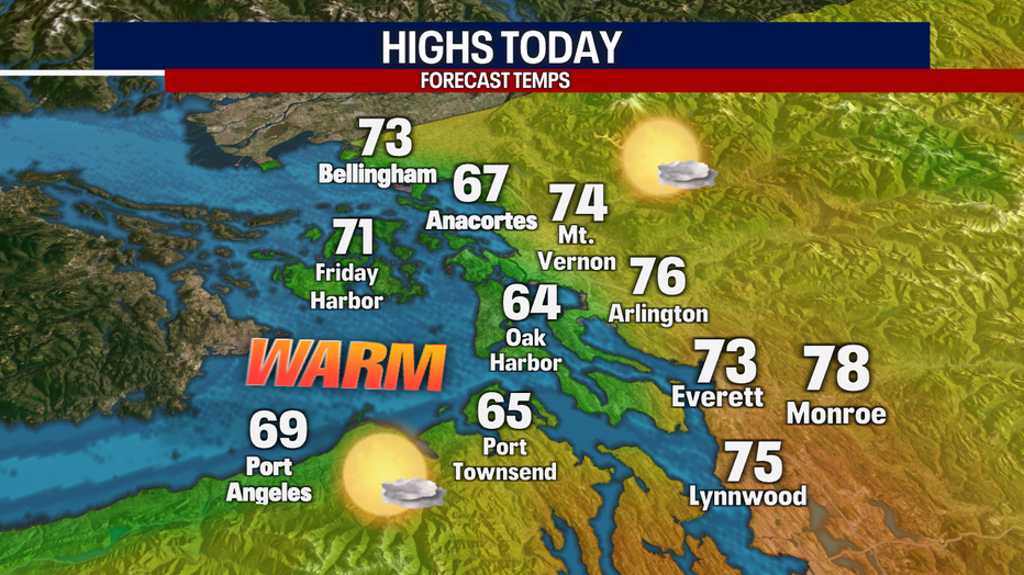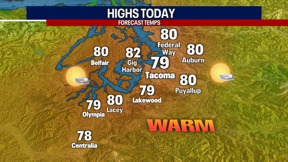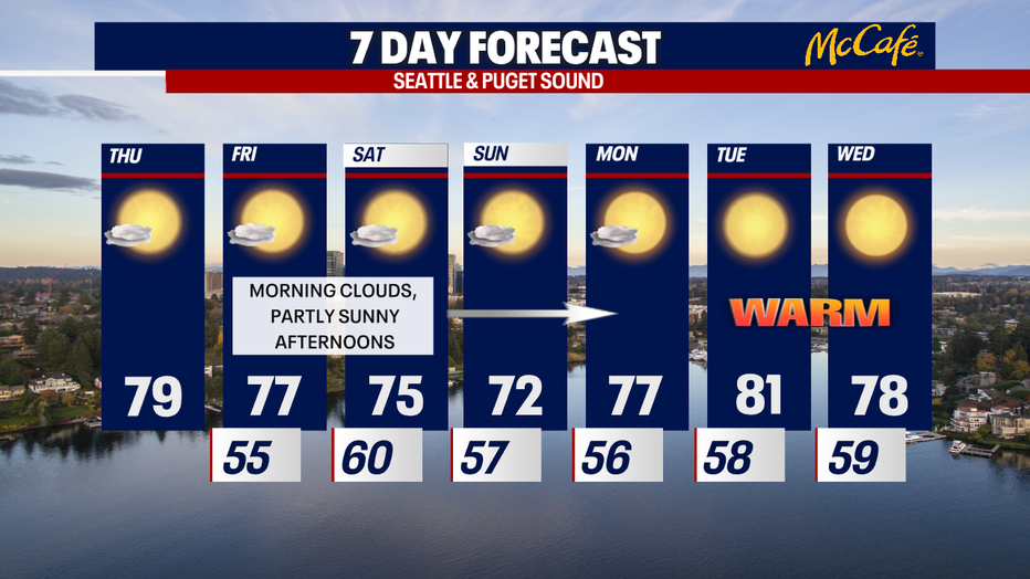 Any clouds this morning are forecasted to clear by noon. Highs will warm to the upper 70s for many places in Central and South Puget Sound. Honestly – it doesn't get much better than this!