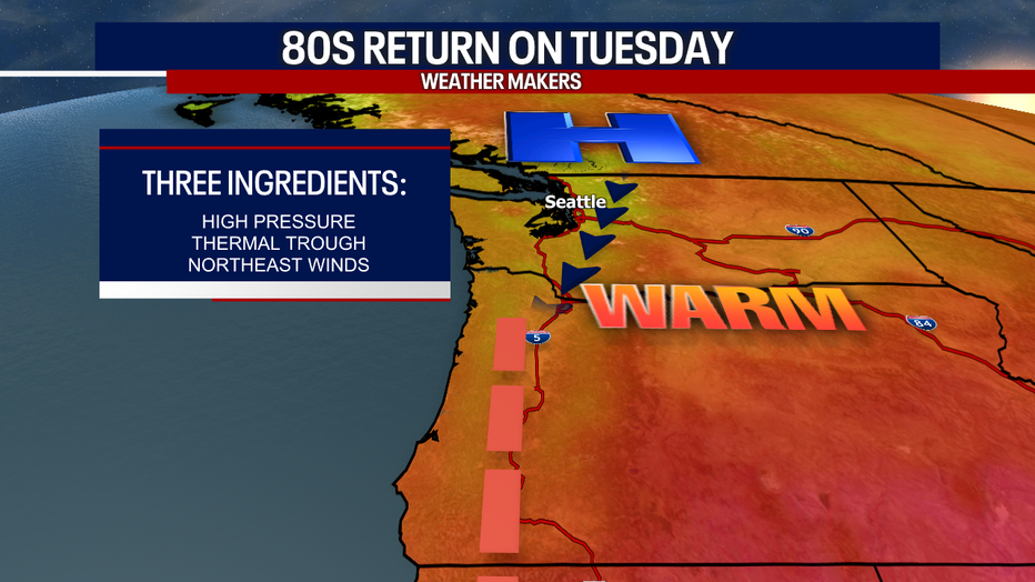 Here's why we expect the 70s almost every day this week: westerly winds will help moderate the warmth by ushering in some cooler/milder marine air. Seattle soars into the 80s on Tuesday because winds will switch to come out of the northeast. This time of year, northeasterly winds tend to be hot and dry.