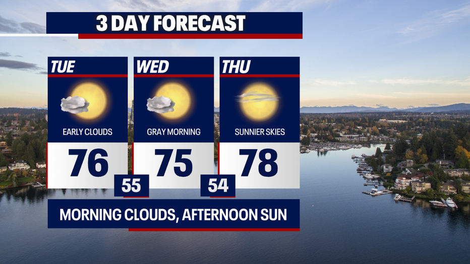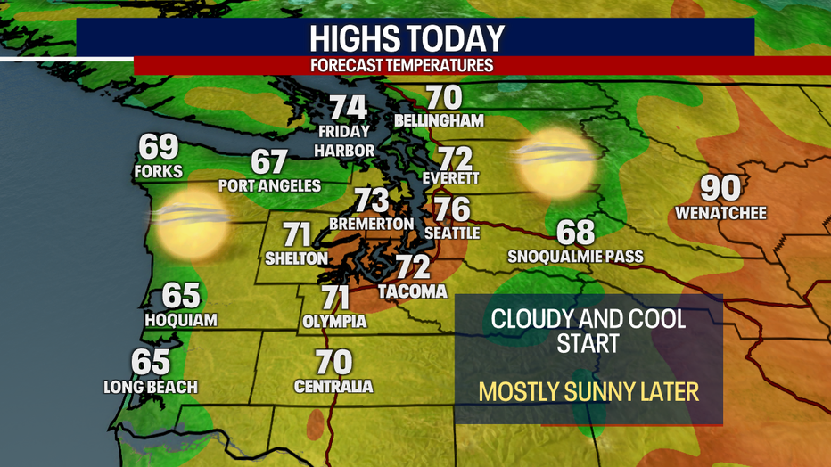 After a cloudy start to the day for many backyards, sunshine will make a strong showing this afternoon. Along the coast, clouds could be rather stubborn, and the high temperatures for the beaches will be cooler as a result (only reaching the 60s). The 70s are in store for most in the Puget Sound lowlands.