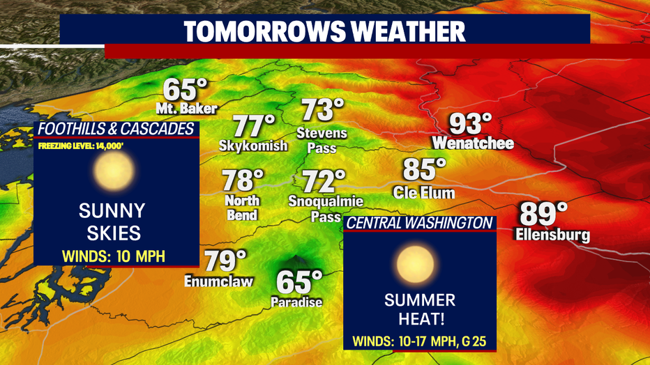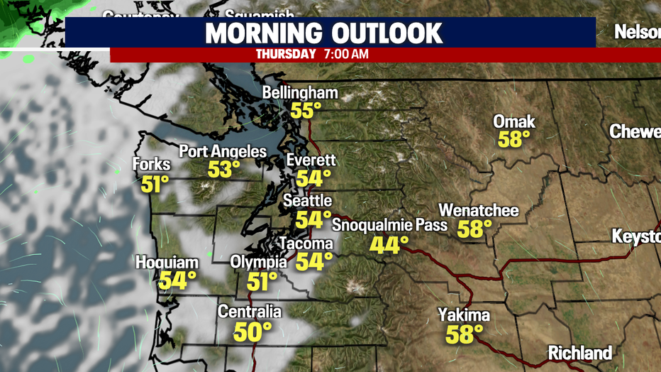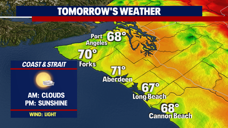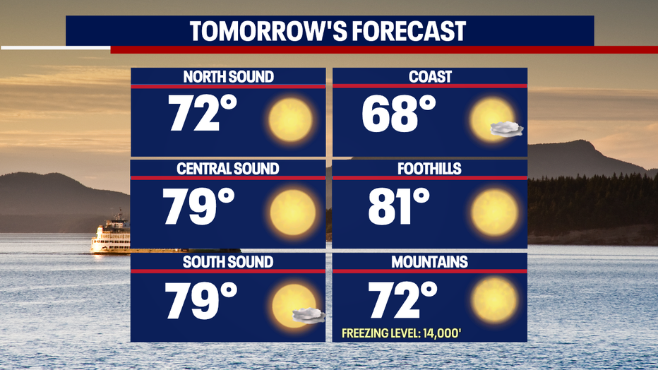 Thursday looks promising for plenty of sunshine! Make sure to grab the sunglasses and sunblock! Highs are the warmest Seattle South landing near 80! If you're looking for cooler temps head to the North Sound where you'll find the low 70s with upper 60s at the coast.