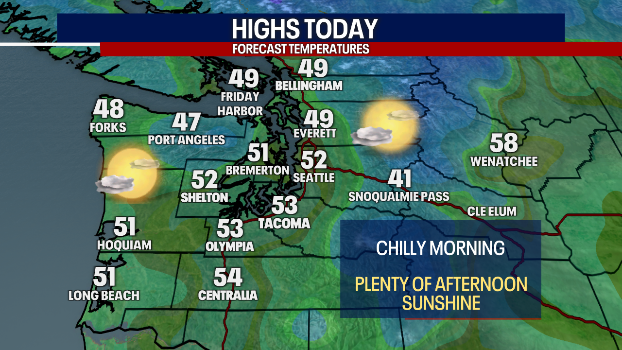 Tonight, skies turn partly cloudy with chilly overnight temperatures. Seattle is expected to dip to around 37 degrees early Monday morning, making for another cool start to the day.