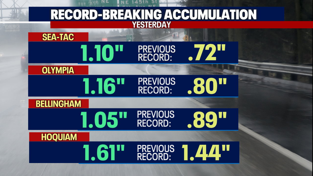 SeaTac, Olympia, Bellingham, and Hoquiam all set new daily records for June 9. SeaTac's total of 1.10" made it the sixth wettest June day on record (since 1945).