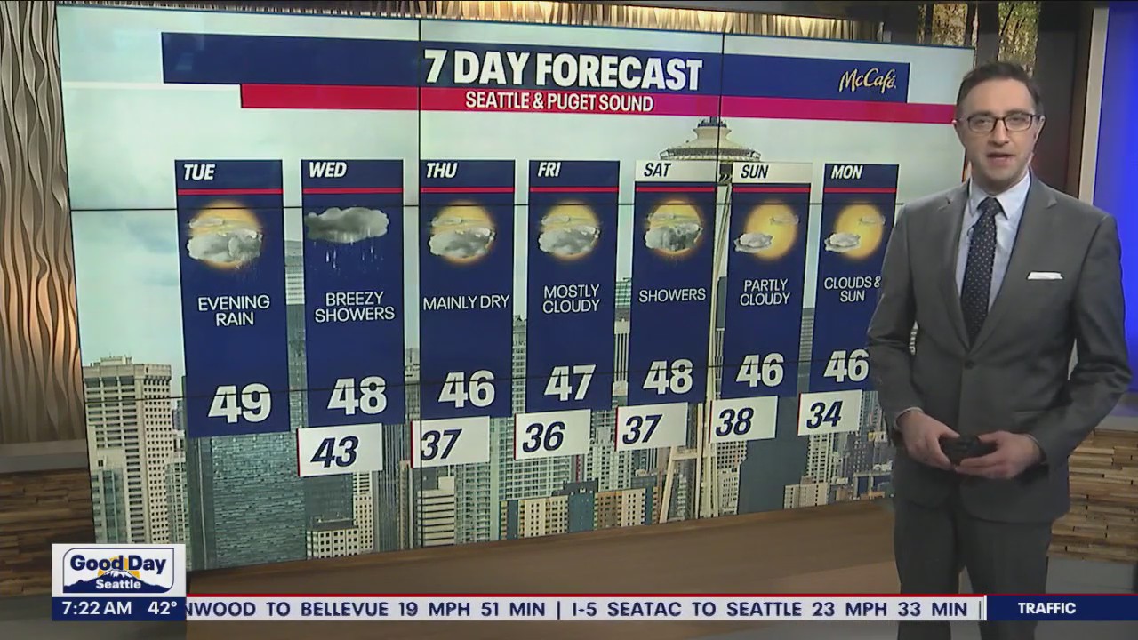Highs today will land in the mid to upper 40s for most. Our bright spots today will be Port Townsend and Poulsbo: these communities will enjoy mainly dry weather (showers roll in after dark).