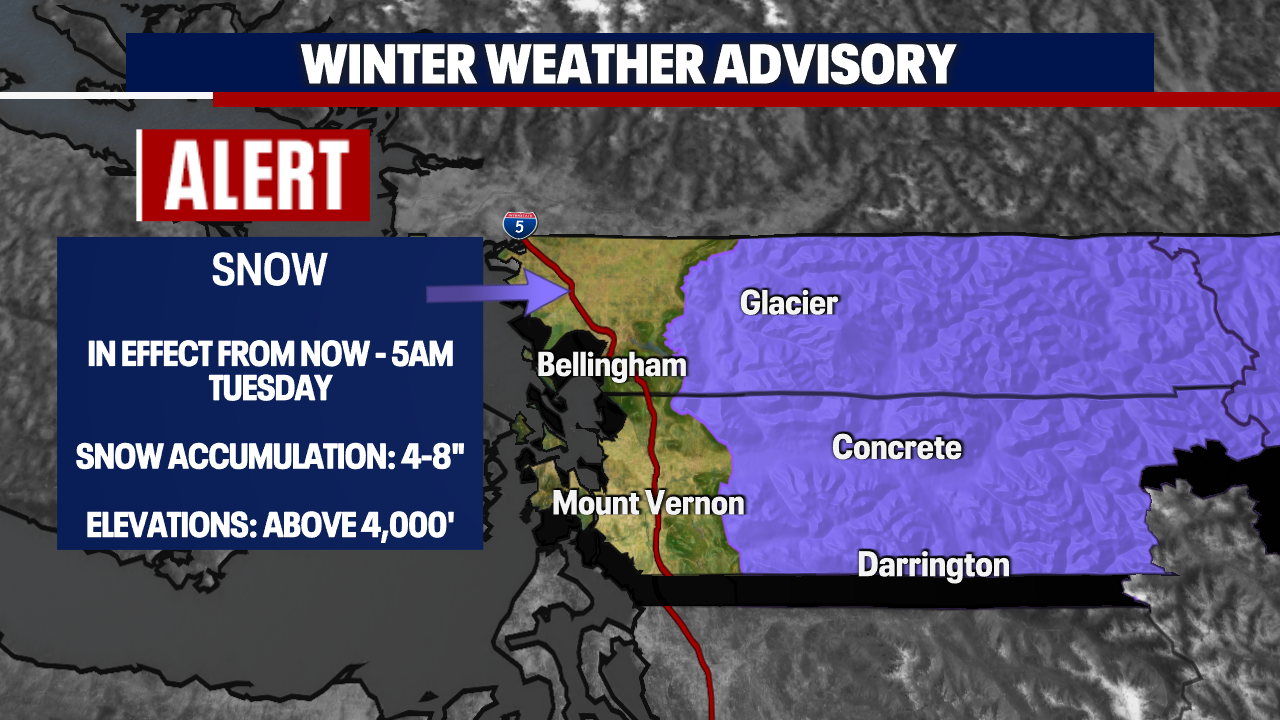 A Winter Weather Advisory is in effect for the northern Washington Cascades. Higher elevations could see four to eight inches of snow through early Tuesday.