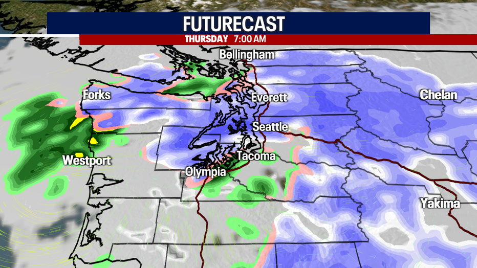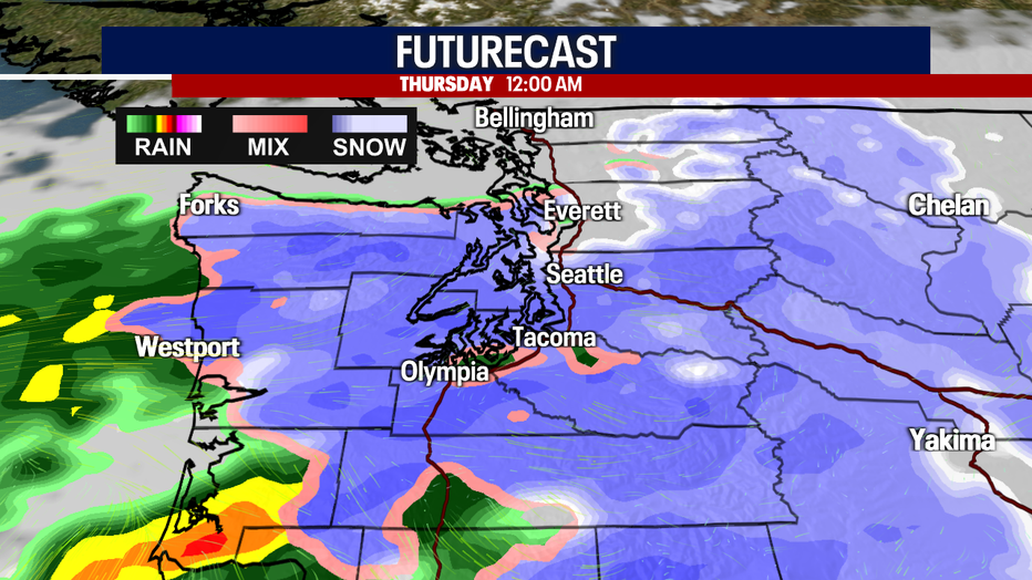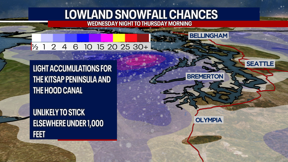 Based on the data right now, it seems most likely that the western side of the Kistap Peninsula, the Hood Canal and Mason County have the best potential for light snow accumulations Thursday morning. It'll be much less likely for snow to stick elsewhere. In order for snow to accumulate in a more widespread fashion, the cold air would need to be much stronger and long-lasting than what most of the forecast models are predicting right now.