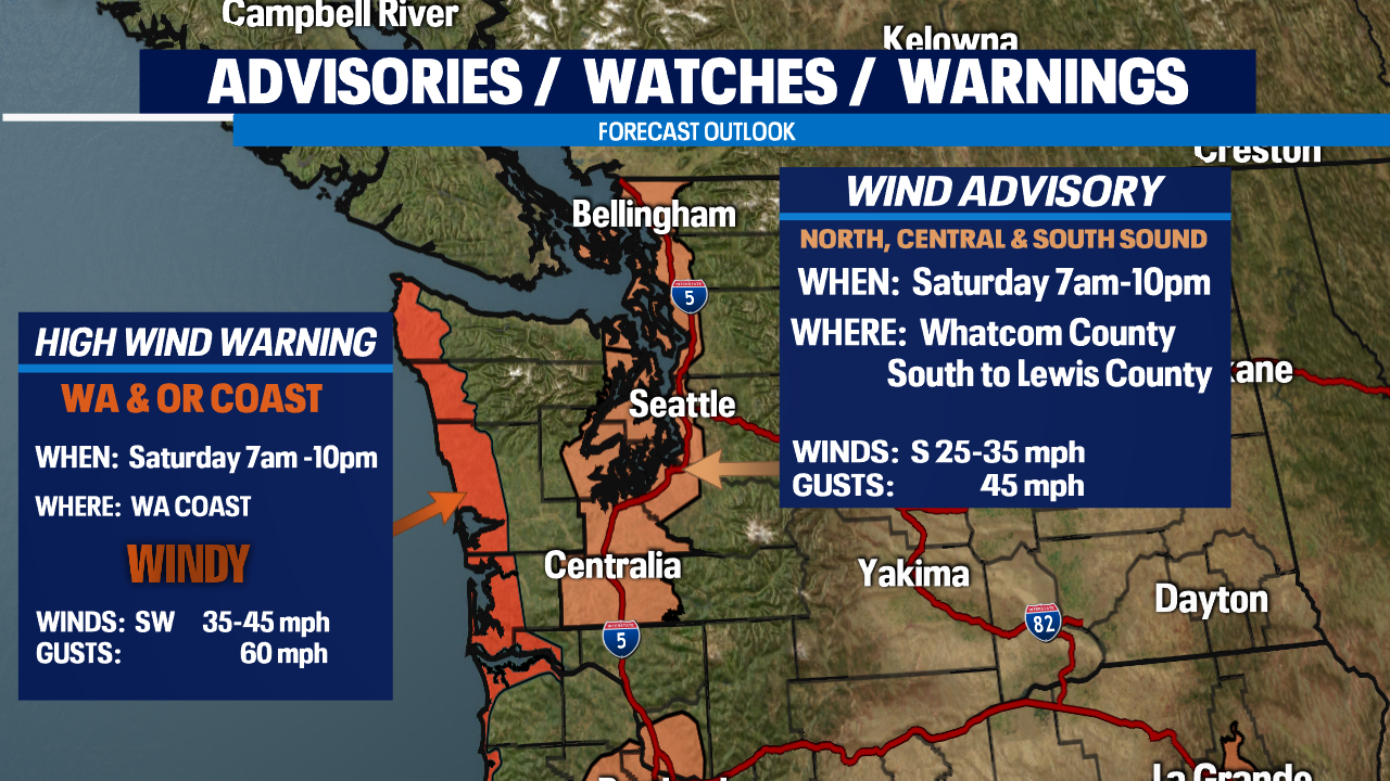 Strongest winds will be seen at the coast to start, but gusts could push to 40+ mph inland. The National Weather Service issuing a High Wind Warning for the WA Coast, High Wind Watch for the SW Coast and finally a High Wind Adisory for most Puget Sound from the Candian border south through Lewis County. This all goes into effect Saturday 7am-10pm. We expect sustained southerly winds 30-40 with gusts up to 50 mph from Bellingham to Centrailia. The coast even stronger, gusting up to 60 mph.
