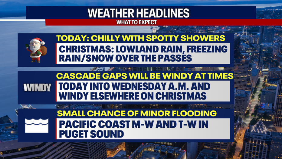 Christmas Eve is looking chilly across Western Washington with breezy pockets and isolated showers. Christmas Day will be soggy, cloudy and cozy around Puget Sound.