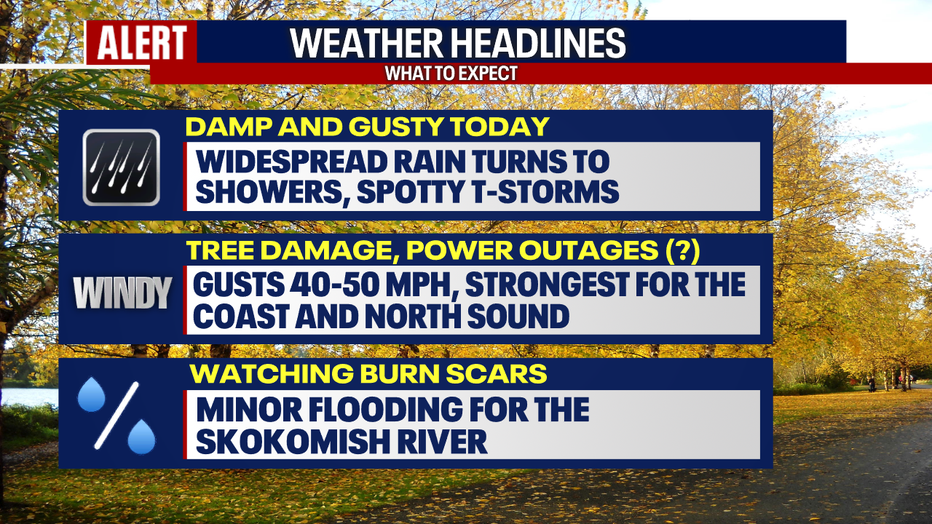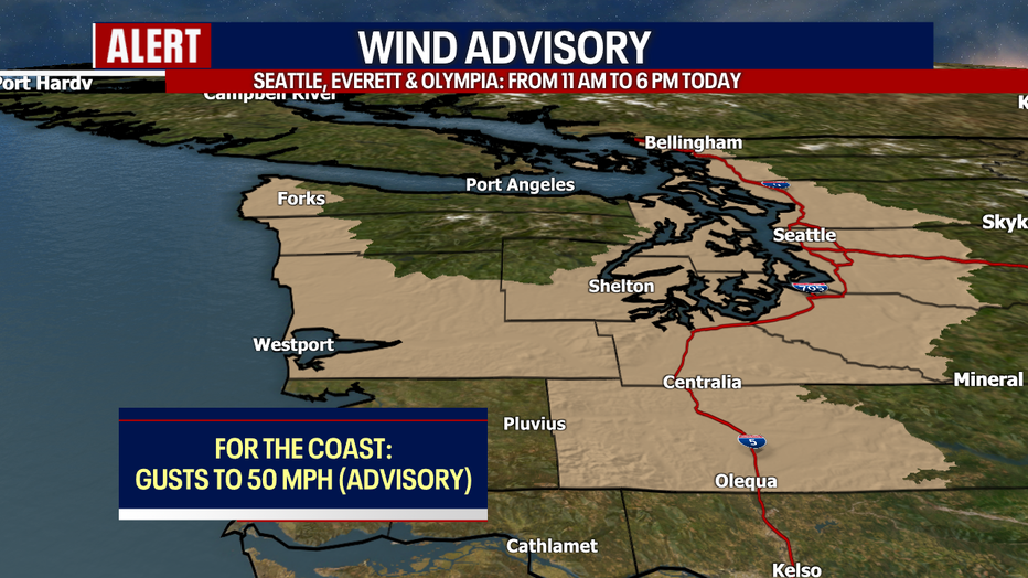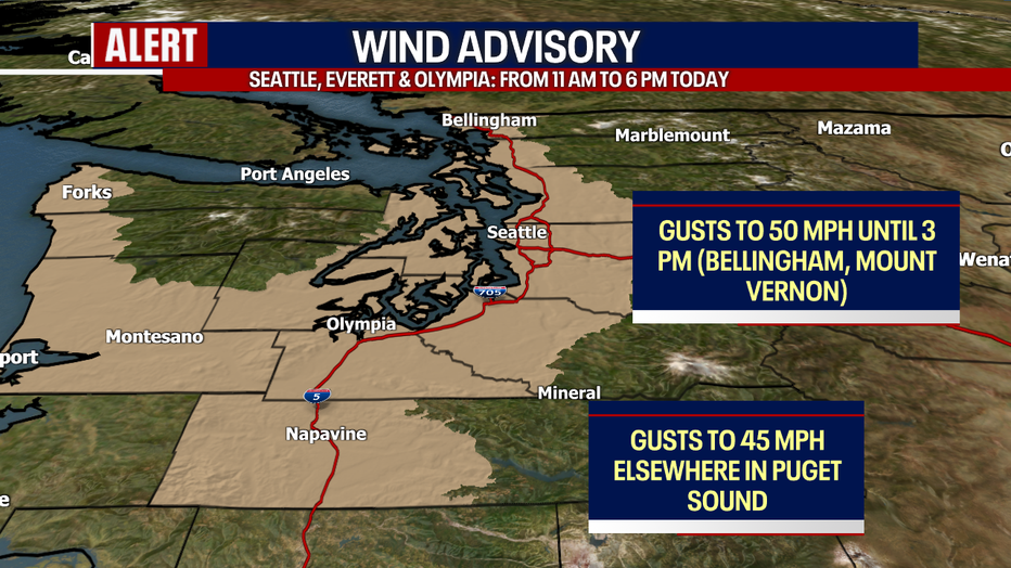 From 11 a.m. to 6 p.m., a Wind Advisory remains in place for Everett, Seattle, Tacoma and Olympia for gusts to 35-45 mph.