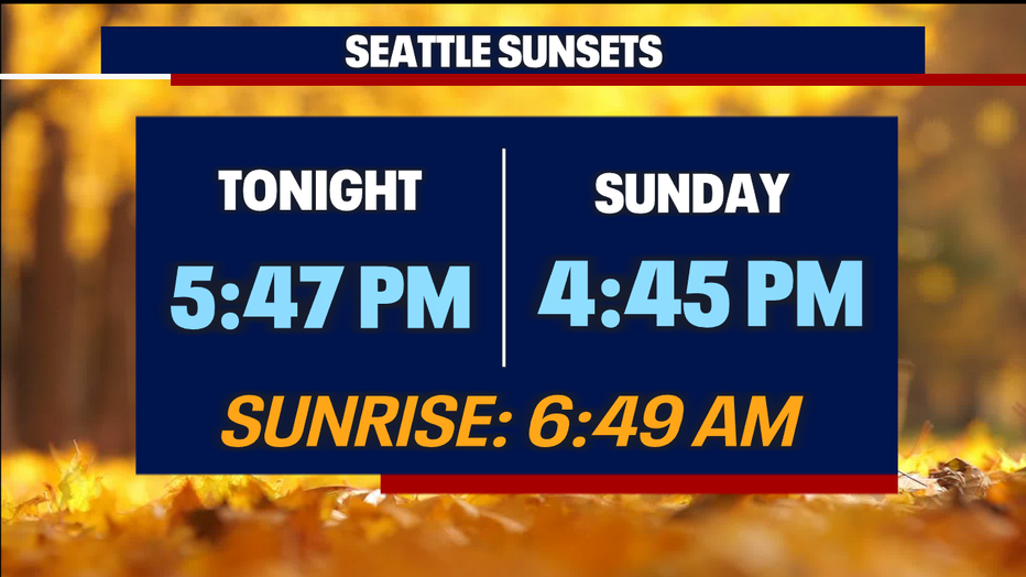 Remember, we "fall back" tomorrow and get an extra hour of sleep. Here's a look at sunset times tonight and tomorrow. Our sunrise tomorrow will happen at 6:49 a.m.