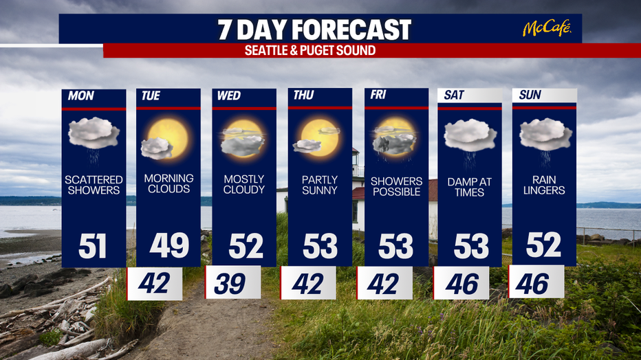 SEATTLE - Once again, we're tracking dark skies and scattered rain in Seattle; however, the wet weather isn't nearly as impactful as what we experienced Friday morning.