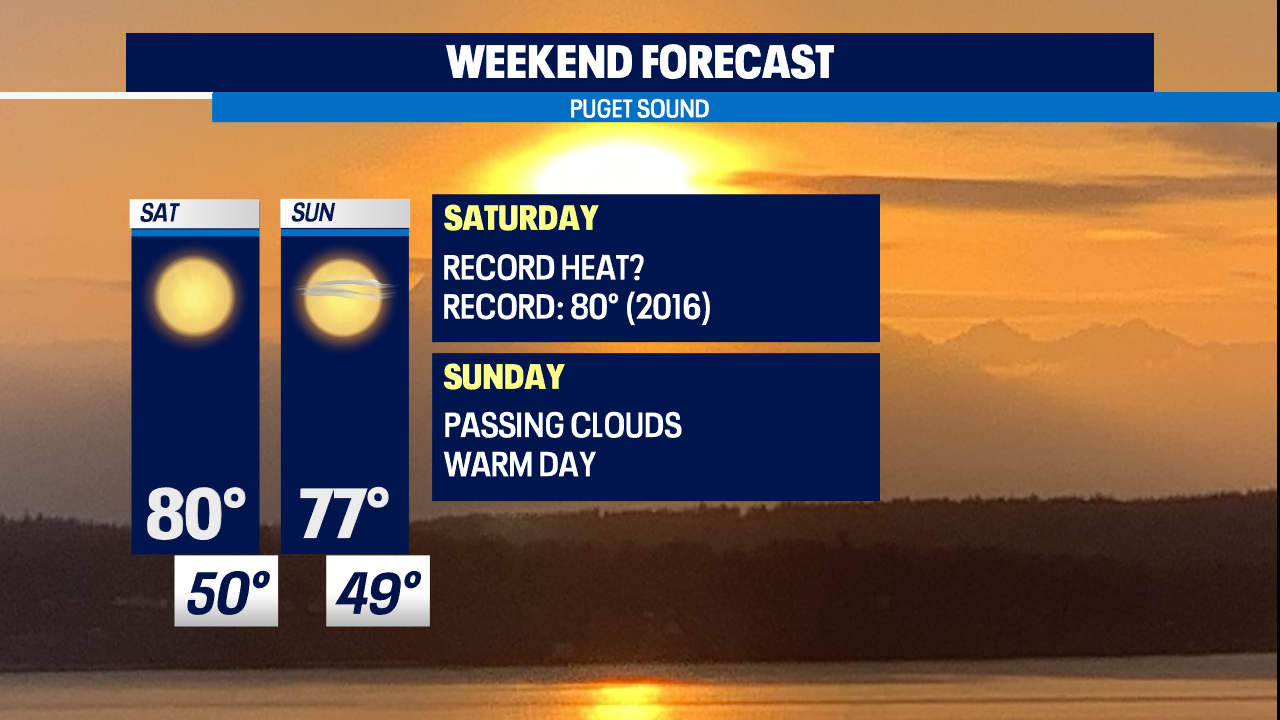 SEATTLE - High pressure will amplify over the region keeping skies sunny and temperatures warm! I am forecasting 80° this afternoon which would tie the record set back in 2016. Expect a few passing clouds Sunday which will keep temperatures a couple degrees cooler near 77°. Still... these temps are well above the average of 59°.