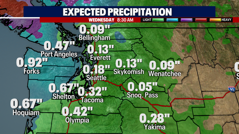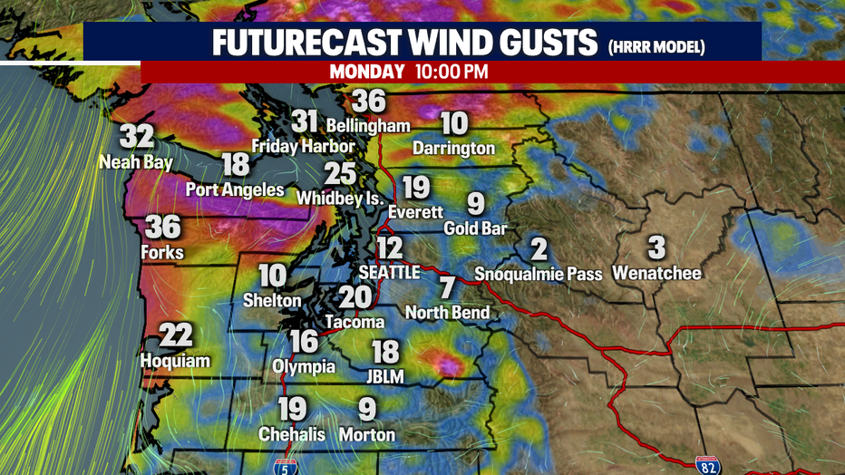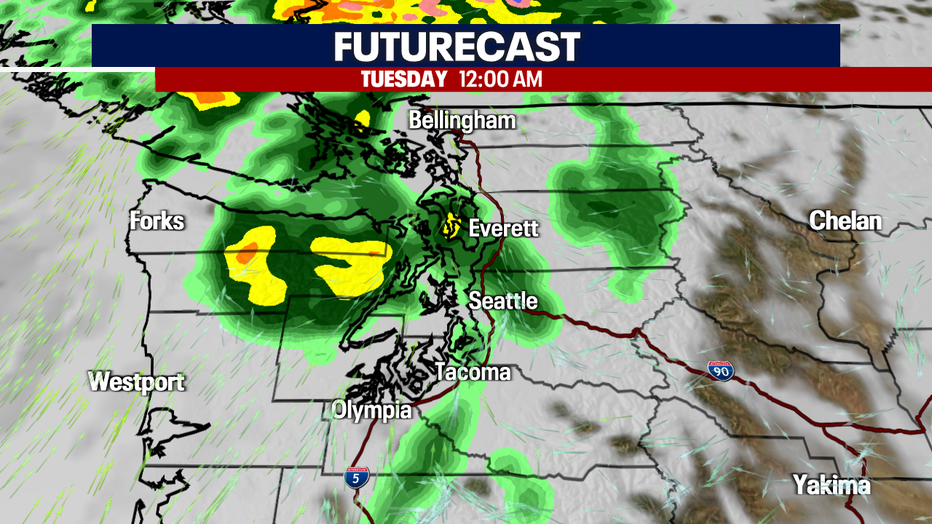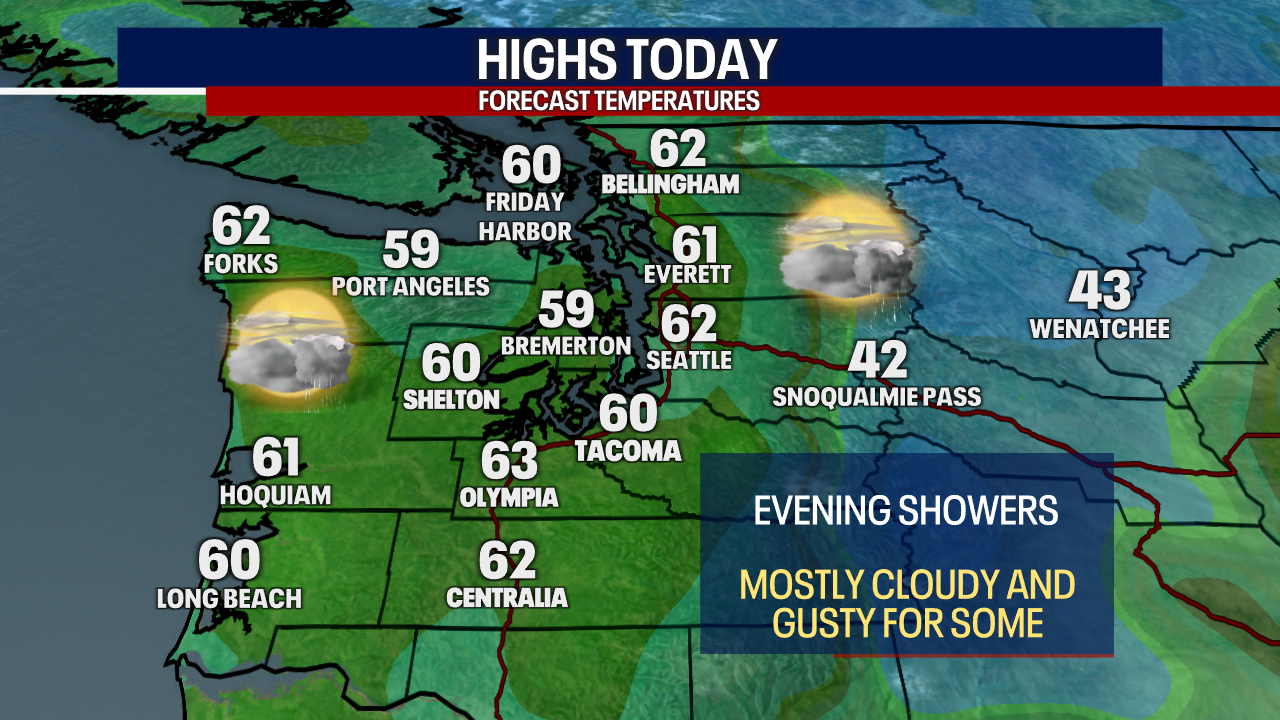 As this system moves inland, usual windy spots along the coast and in the north Puget Sound areas could see gusts between 30 to 40 mph. Winds will calm by morning.